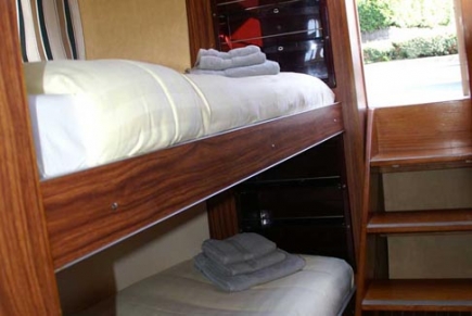 Two rear cabins : choice between two single berths or one double berth. Forward cabin : one double berth. Lounge : seat convertible to a double berth.